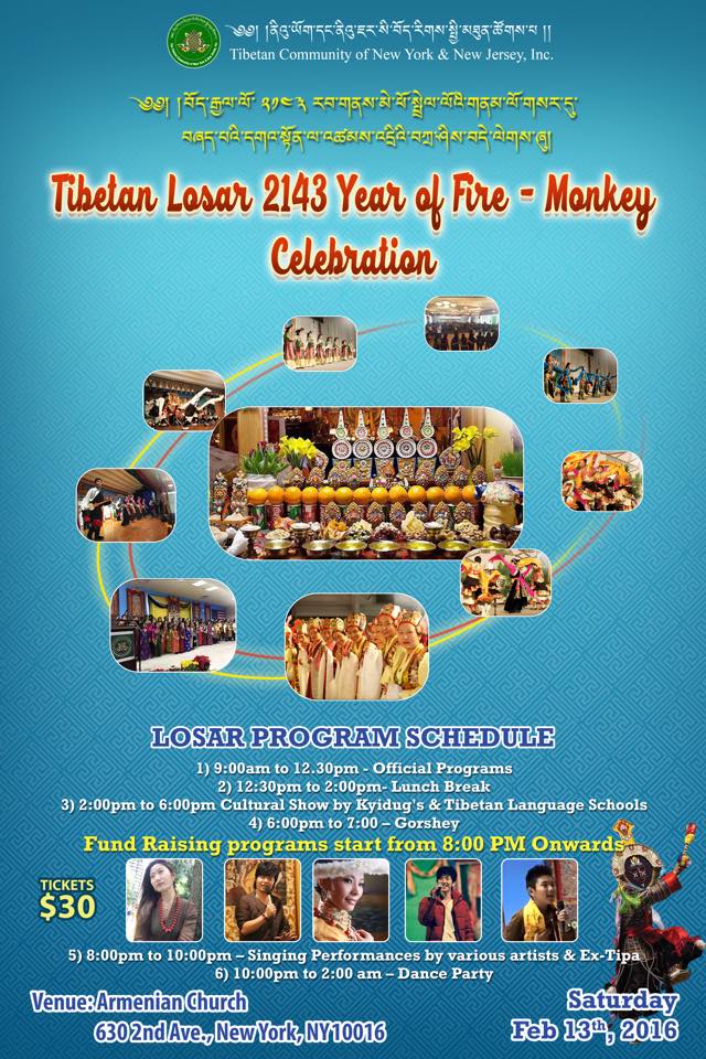 Tibetan Community of New York & New Jersey is organizing this year Tibetan Losar(year of fire-monkey 2143) public gathering on Saturday, February 13, 2016 at Armenien Church, New York.